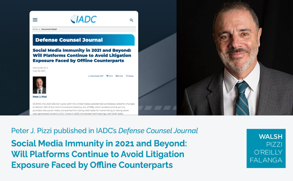 NEWARK, NJ – Walsh Partner Peter J. Pizzi, CIPP/US has published an in-depth article in IADC’s Defense Counsel Journal Volume 88, No. 3 explaining the elements of the statutory immunity granted by Section 230 of the Communications Decency Act of 1996 and summarizing complaints against the current scope of Section 230 as interpreted by the courts. Pizzi also explores whether the problems observed with social media have resulted from Section 230 itself, from the engagement-focused technologies delivered by Silicon Valley, or from a combination of these and other factors.
